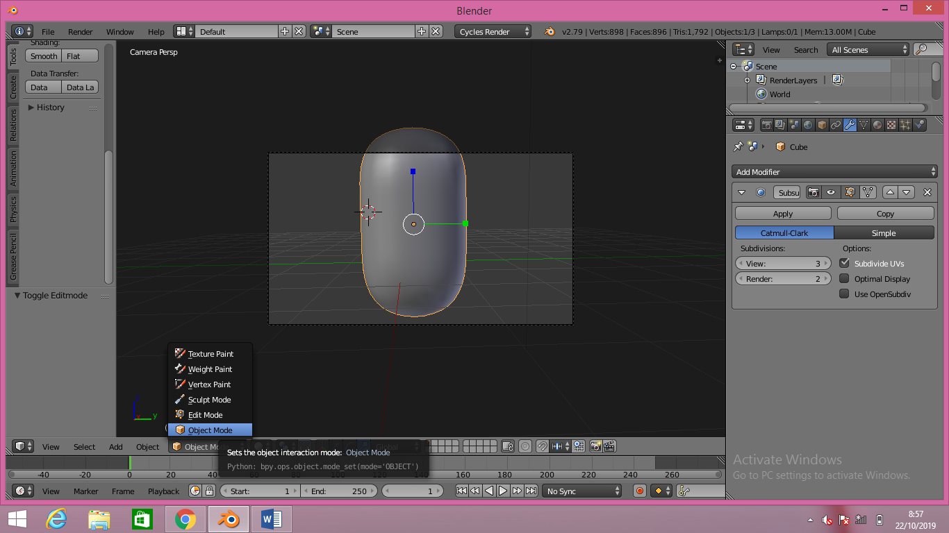 Lalu ubah tampilan cube agar menjadi seperti oval dengan cara pilih object yang ada disebelah kanan yaitu object modifiers. Lalu akan muncul seperti gambar diatas pilih Subdivision Surface lalu bentuk akan berubah seperti gambar diatas.